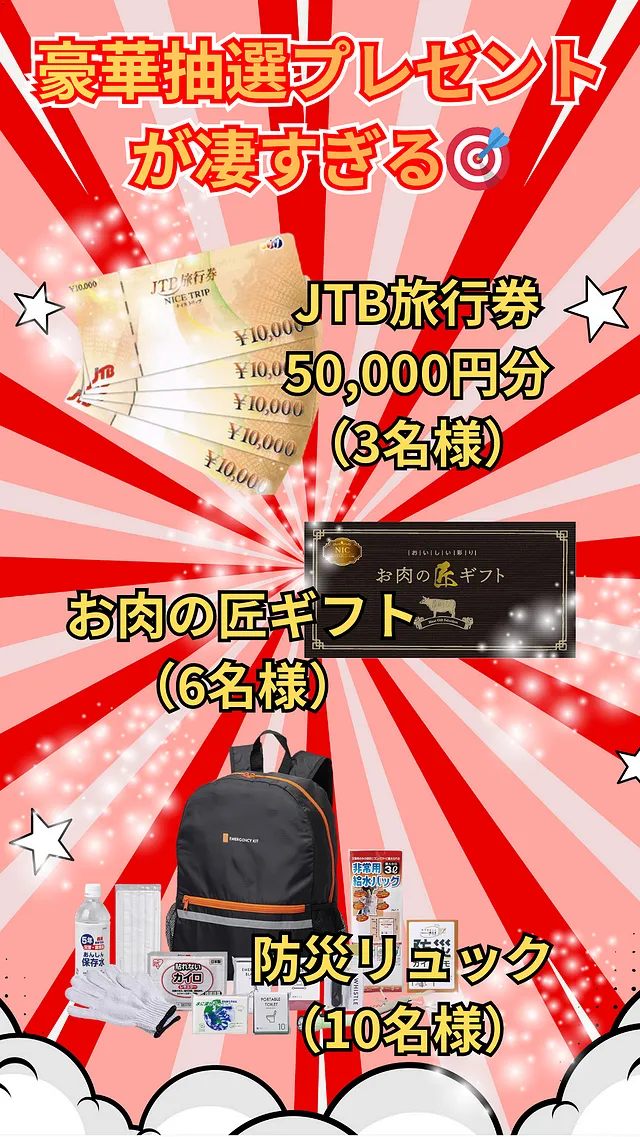 ②さらに抽選で「JTB旅行券5万円分」「お肉」「防災リュック」が当たるチャンス!