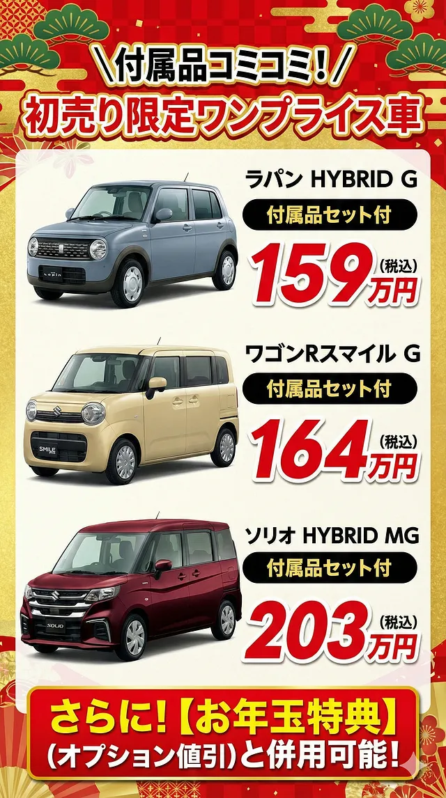 人気のラパン、ワゴンRスマイル、ソリオが付属品コミコミの衝撃価格で登場!