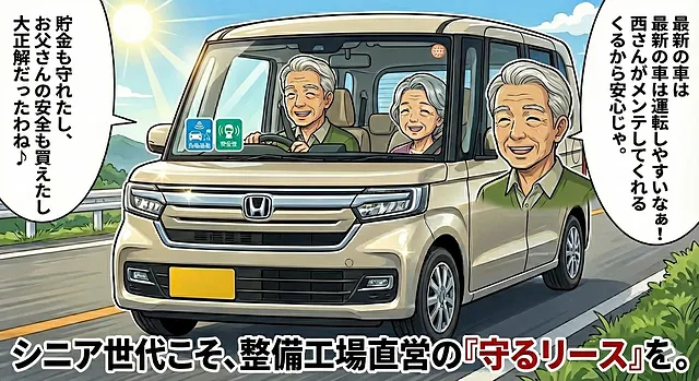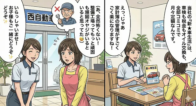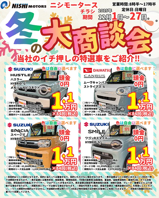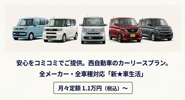 西自動車のカーリース「新☆車生活」とは、7年間のリース期間で月々定額のお支払いの中に、新車の車両代はもちろん、車検、税金、オイル交換などの基本的な維持費がすべてコミコミなっている安心お得なプランです。月々定額のお支払いなので大きな出費がまとめて出ていく心配もありません。国内全メーカー・全車種・グレード・オプションも自由に選択できます。お客様が安心して『乗るだけ』のお得なマイカーリースとなっております。