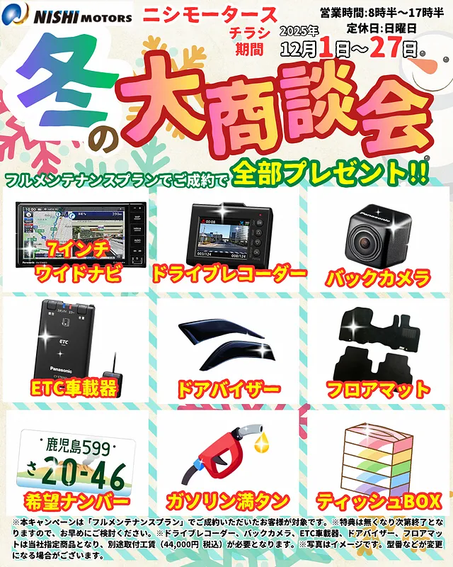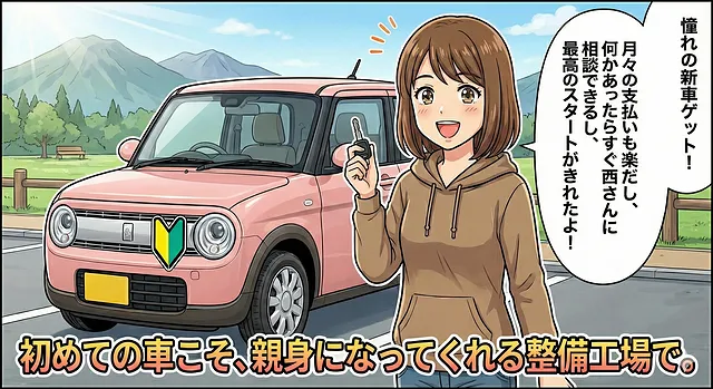 新☆車生活には、車検2回やオイル交換14回分などの基本的なメンテナンスがすべてコミコミです。さ・ら・に!ニシモータースのオリジナル充実メンテナンスプラン『あんしんプラン』では、法定点検やバッテリー交換などの16項目を追加した安心安全なプランでお客様のカーライフをトータルサポートします。