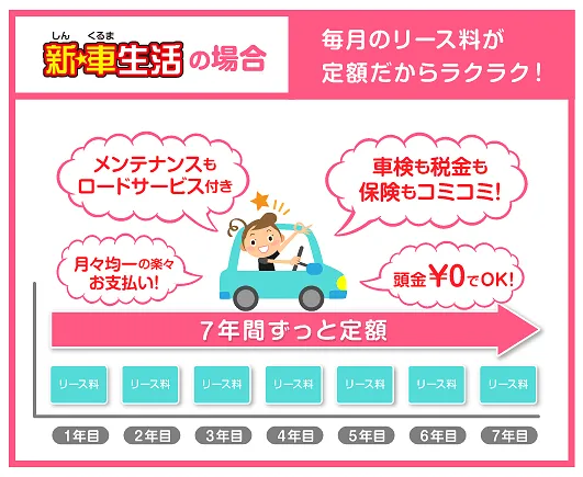 新★車生活のマイカーリースは7年リースで月々定額支払いの中には、車検・税金・メンテナンスなどすべてリース料に含めています。急な出費を心配する必要もなく、家計も安心な、優しいリースプランです。