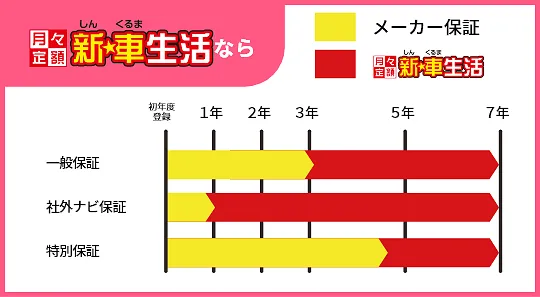 「あんしんプラン」には、7年延長保証がついています。 一般的にメーカーの一般保証や特別保証は3年~5年、社外ナビも通常1年の保証期間になっていますが、新★車生活では、お客様に安心してお車にお乗りいただけるように7年間の長期保証がついています。