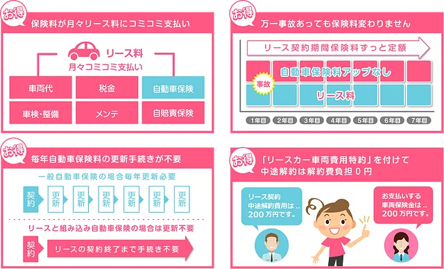リース契約には含まれておりませんので、別途契約する必要があります。自動車保険をリース料に含んで支払いをすることができます。メリットとしては