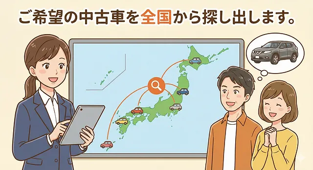 日本全国の販売会場から、お客様ご希望の1台を探し出しますので、ご相談の際には、お気兼ねなくご希望をスタッフまでお伝えください。