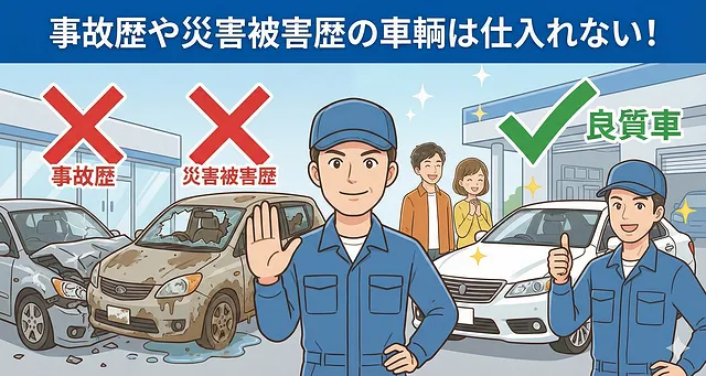 ご安心ください。当店の中古車は、整備士の目で選び、その整備士が徹底的に点検・整備を行った車両のみを販売しております。また、事故歴などのある中古車は仕入れをいたしません。