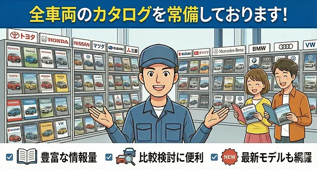 店頭には販売している全車両のカタログがございます。乗りたいお車が決まっていなくても、ぜひ冊子を手に取ってご覧ください。空きがあればそのまますぐに試乗もできますので、お気軽にスタッフまでお申し付けください。