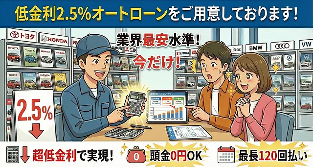 新しい車を手に入れるとき、金利は大切なポイントですよね!私たちの低金利2.5%オートローンなら、月々の支払いがぐっと楽になります。