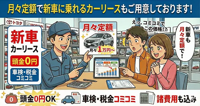 新車を購入する際に、月々の支払いが気になる方も多いですよね。そんな皆さんに朗報です!私たちのカーリースプランでは、毎月定額で新車に乗ることができるんです。これなら予算管理も簡単で安心ですね。