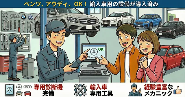 輸入車のオーナーのみなさん、安心してお任せください!私たちの工場にはベンツ・アウディなど、さまざまな輸入車に対応できる専用設備が整っています。最新の診断機器を駆使し、新型車でも問題なく対応可能です。